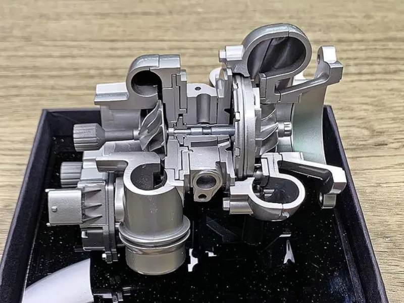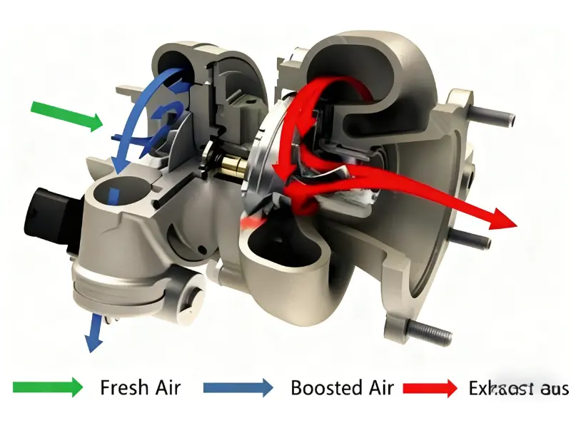 Turbocharger mempunyai dua bahagian utama: turbin dan pemampat.